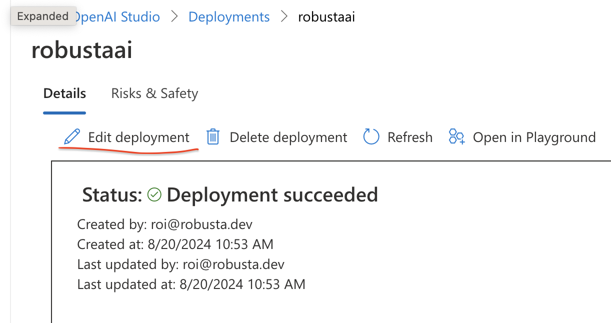 The following steps cover how to obtain the correct AZURE_API_VERSION value and how to increase the token limit to prevent rate limiting.