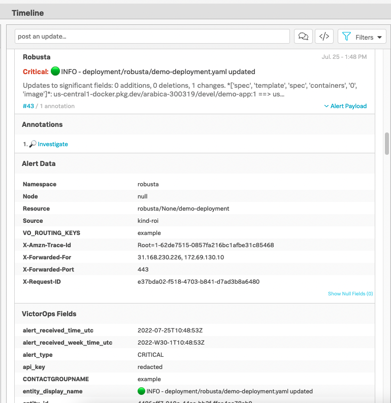 Robusta can report issues and events in your Kubernetes cluster to the VictorOps alerts API.