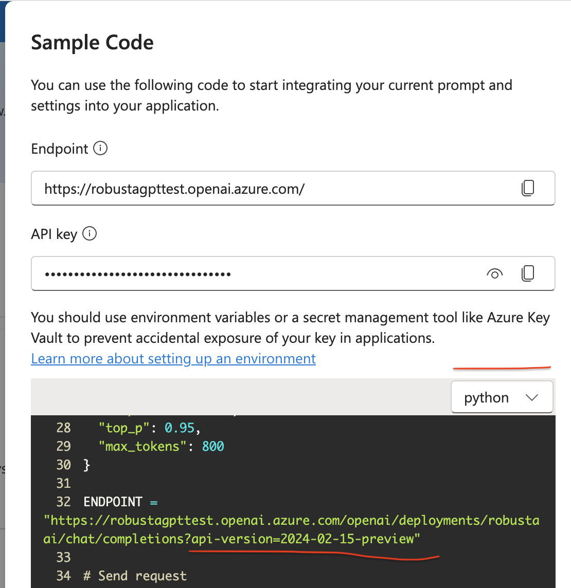 Choose Python and scroll to find the ENDPOINT, API_KEY, and API_VERSION. Copy them! You will need them for Robusta's Helm values.